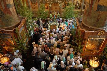 The Great Vespers of Pentecost evening features three long prayers at which the faithful kneel for the first time since Easter. The Monday after Pentecost is the feast of the Holy Spirit in the Orthodox Church, and the Sunday after Pentecost is the feast of All Saints. This is the logical liturgical sequence since the coming of the Holy Spirit is fulfilled in men by their becoming saints, and this is the very purpose of the creation and salvation of the world. Thus says the Lord: Consecrate yourselves, therefore, and be holy, for I your God am holy (Lev 11:44-45, 1 Pet 1:15-16).